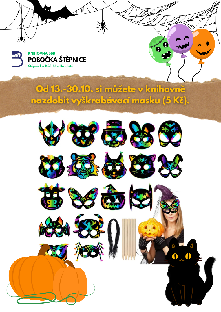Od 13.‑30.10. si s dětmi můžete přijít do knihovny vyškrábat masku třeba na Halloween. (5 Kč)