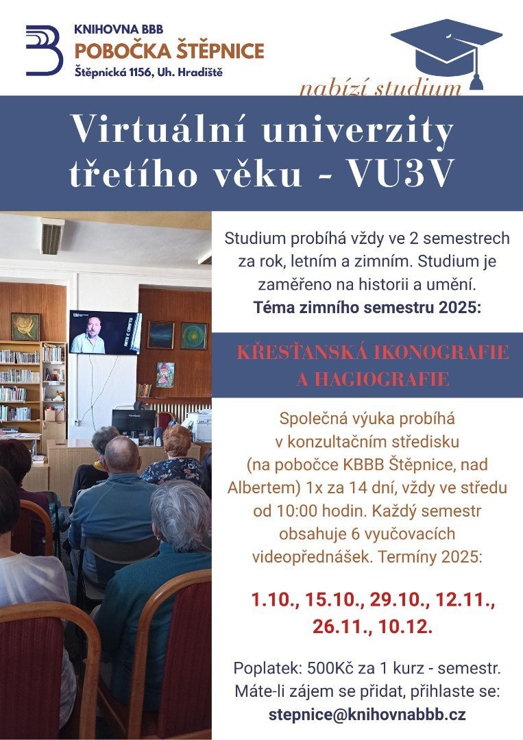 Ve středu 1.10. zahajuje první přednáškou VU3V pro seniory nový semestr. Přihlášky pro nové zájemce o studium v knihovně.
