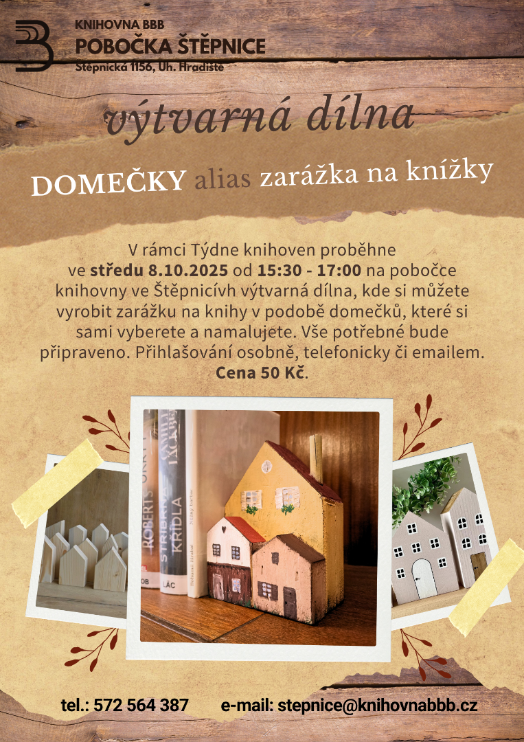 Ve středu 8.10. přijďte na výtvarnou dílnu DOMEČKY alias zarážka na knihy, která se koná v rámci Týdne knihoven od 15:30‑17:00 hod. Je nutno se předem přihlásit.